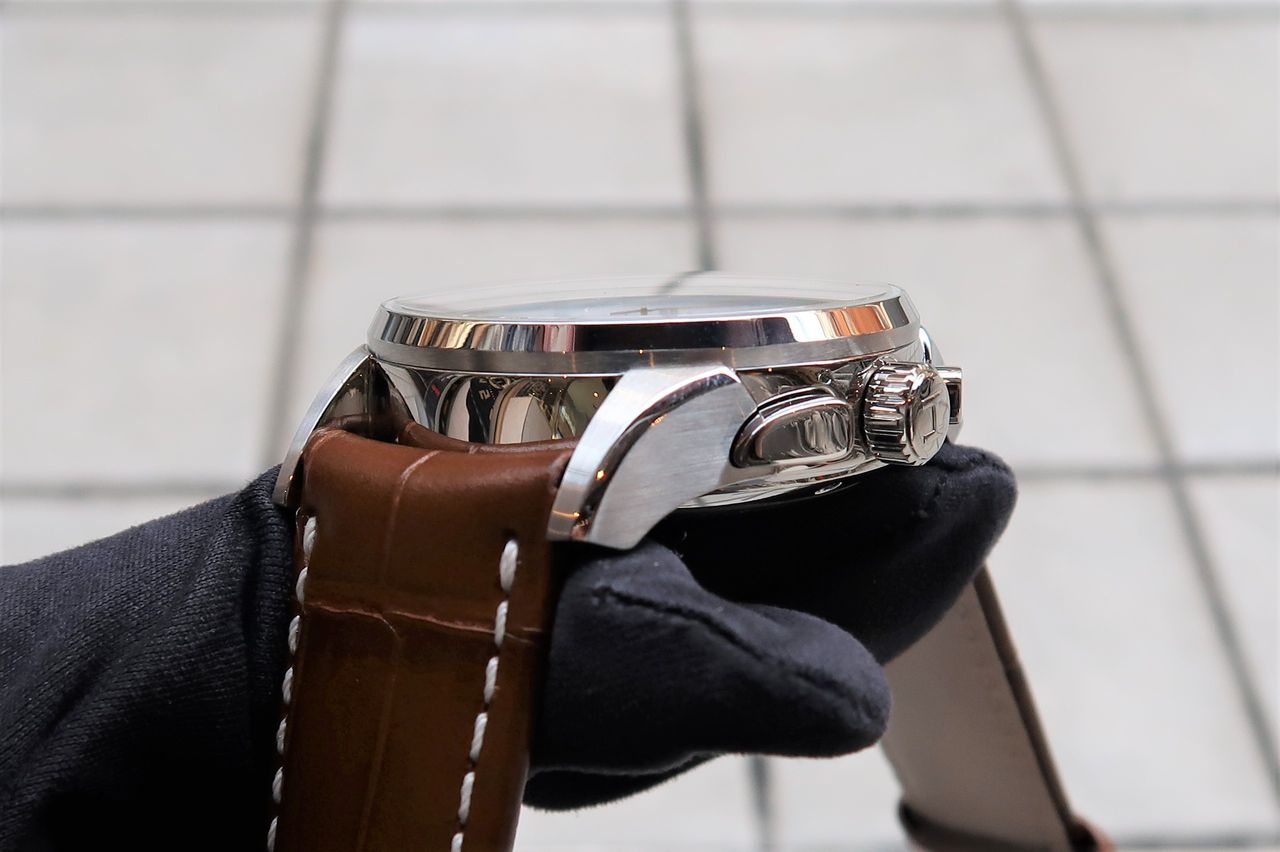 クロノグラフのプッシュボタンもケースに添うように削られ、