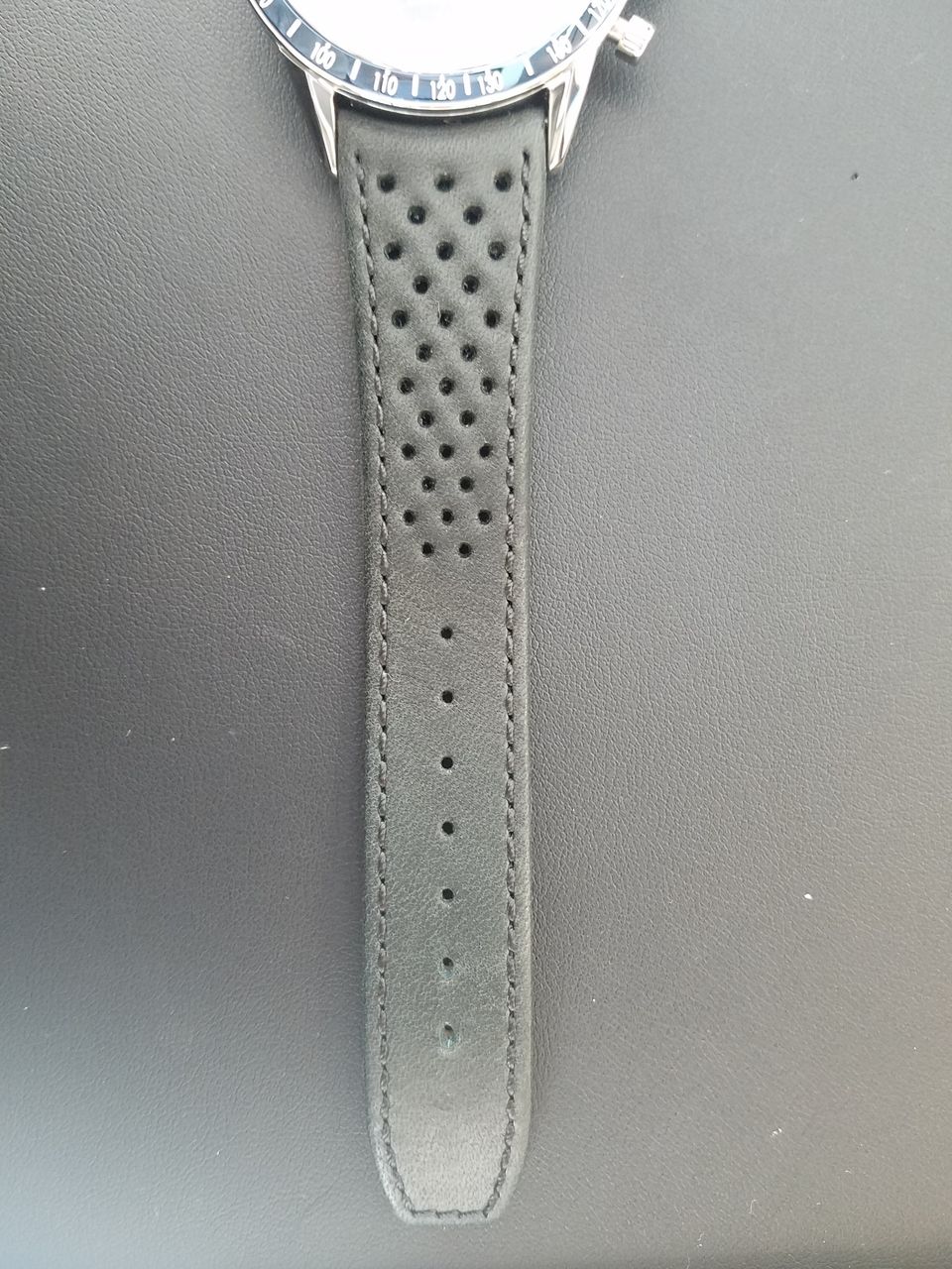ブラックのパンチングカーフストラップなので、本来は汗水に弱い革ですが