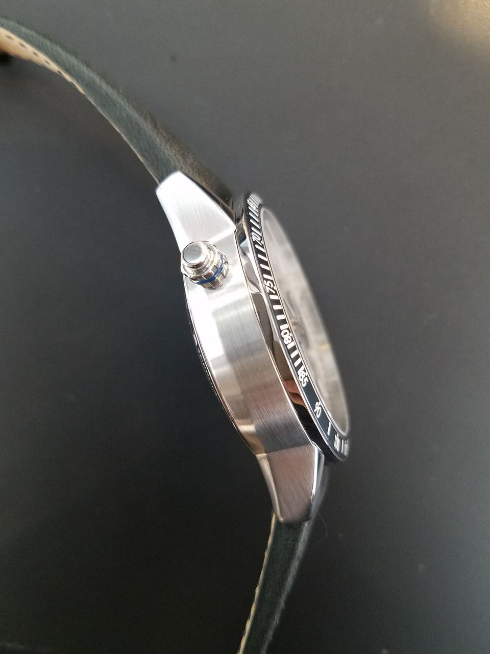 ケース径43.5mm、10気圧防水、ベゼルはブルーPVD加工です。