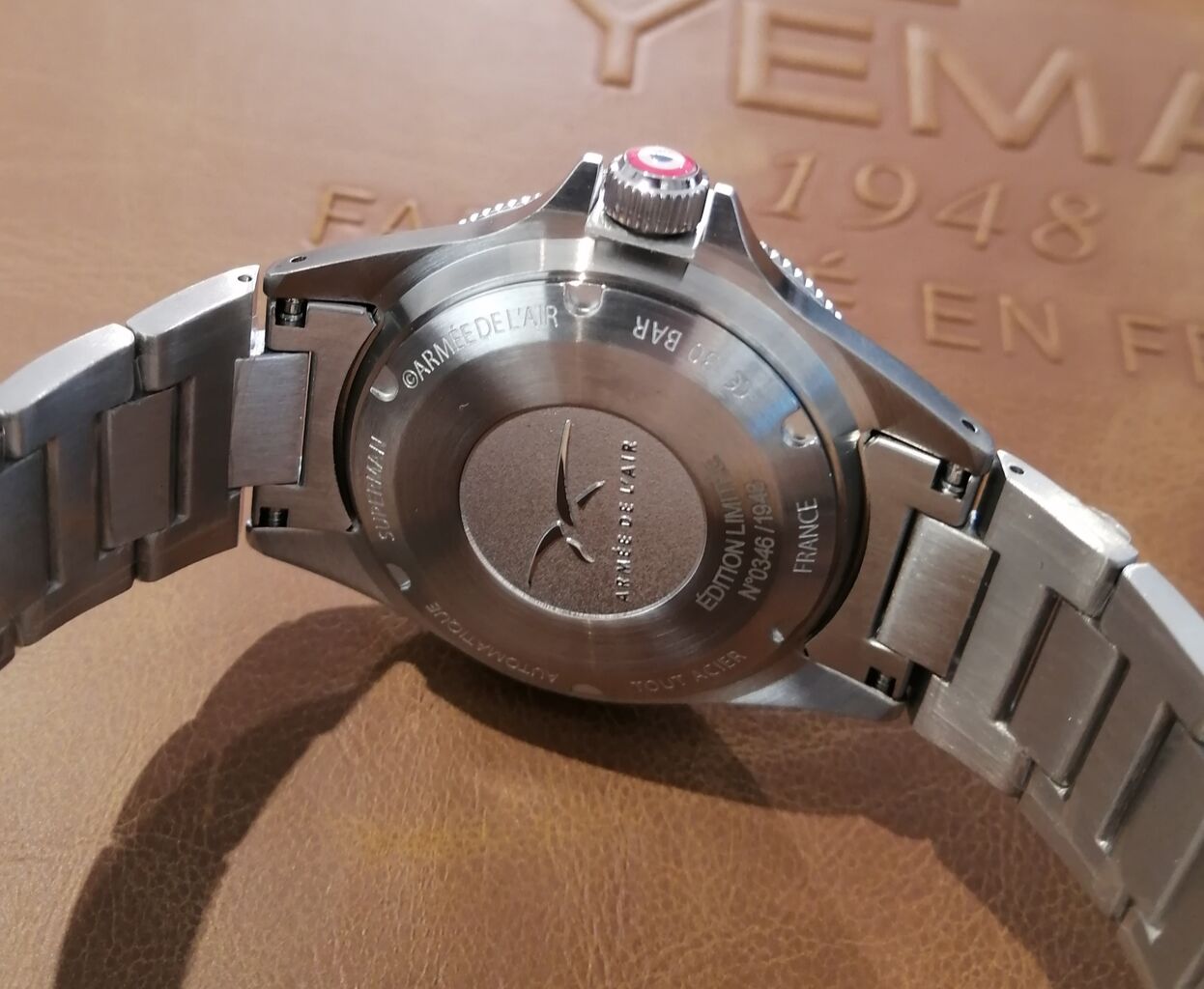 裏蓋にはエンボス加工されたフランス空軍の紋章が美しく刻まれています