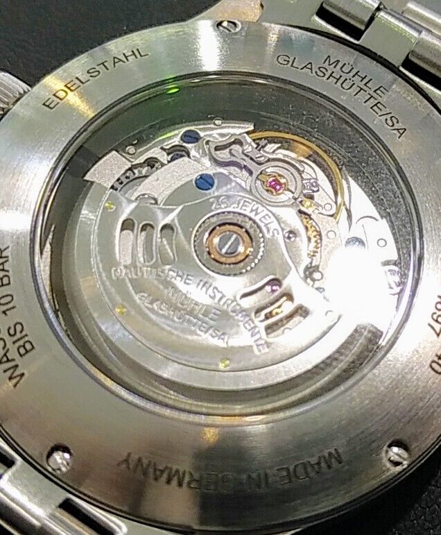 ミューレ・グラスヒュッテ独自の「ウッドペッカー緩急針」や「ミューレローター」を使用し、「ミューレファインチューニング」と呼ばれる、歯車等のパーツを硬化/研磨する事により、摩擦係数が軽減され安定した精度が得られる独自の手法を駆使した、実用性と審美性を兼ね備えたムーブメントとなっております