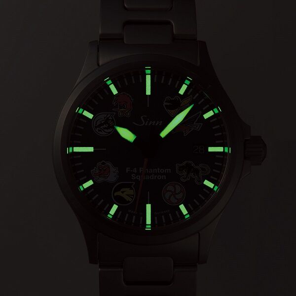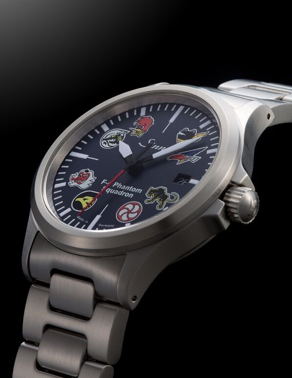 ネイビー文字盤に、第1弾と同じく航空自衛隊で F-4 ファントムを装備していた 8 つの飛行隊の部隊マークが引き立っています。